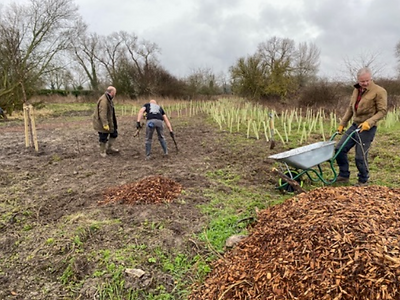 We launched the project in Blewbury Village Hall in February 2023 by having some guided walks to the site and an afternoon tea. Over 100 people attended, and over 30 volunteered to help with the maintenance. We’ve spent about a morning a month since then maintaining the paths and hedging plants (to stop them being choked by nettles and thistles), mulching the trees and strimming a sitting